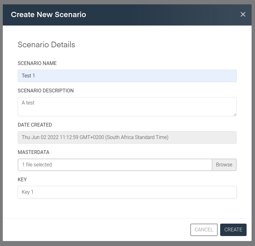 A scenario is created by clicking on Create Scenario, loading the file containing the model information and data (for example in JSON format) and selecting a key to run the solve against. Once Create is selected, the model will be sent to the Icepack API to be solved.