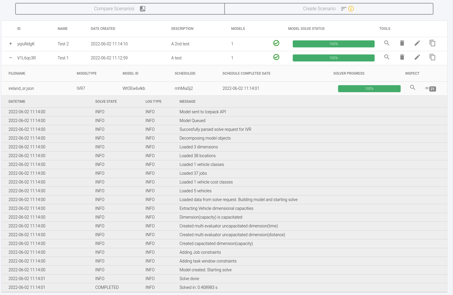 Each created scenario is listed in a table showing information about the scenario and the status of the solve. More specific details about the solve are also available after clicking on the plus sign to the left of the scenario ID and then the icon with the number on the far right hand side.