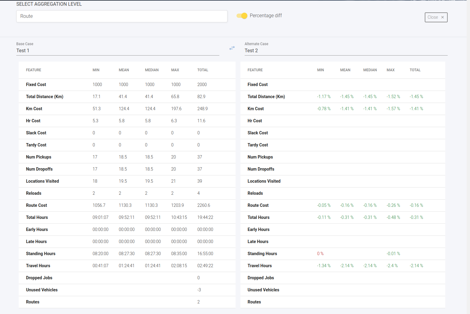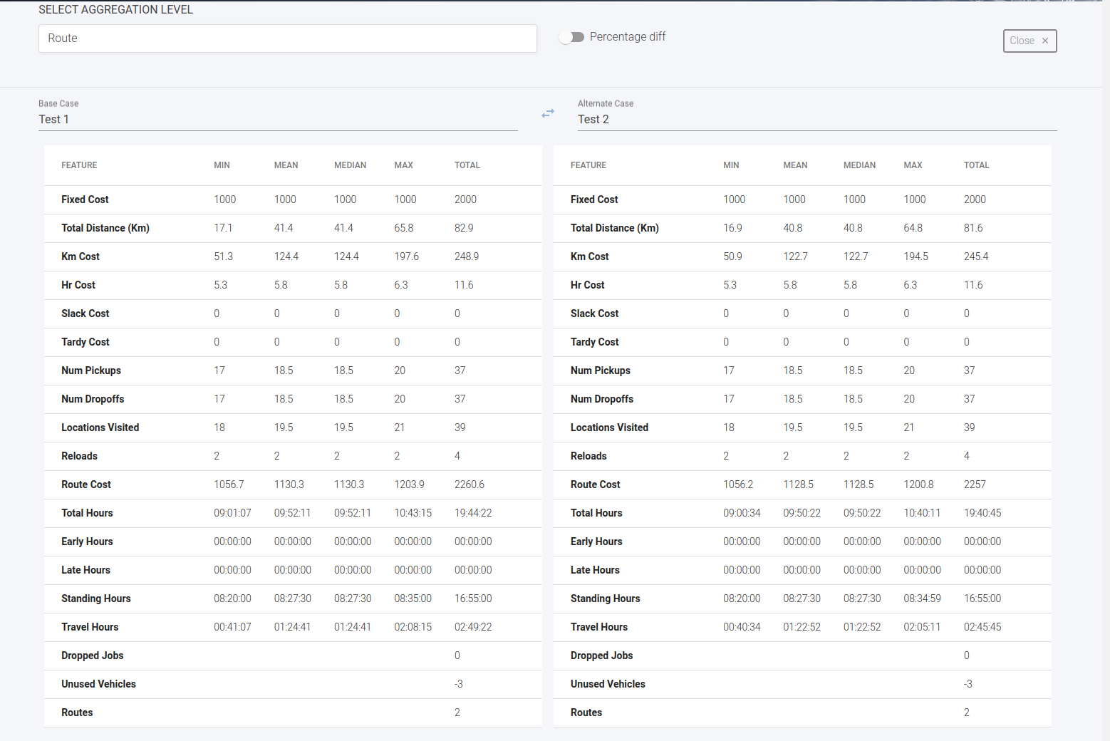 Different scenarios can be compared by clicking on Compare Scenarios and selecting two scenarios to compare, choosing the aggregation level (route or schedule) and whether or not to show the percentage difference between the two scenarios.