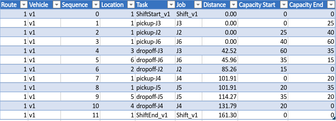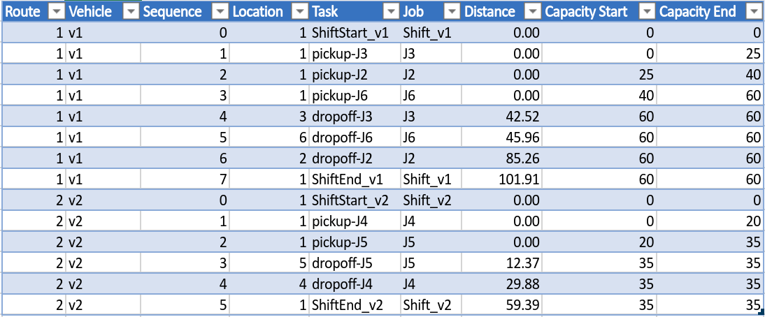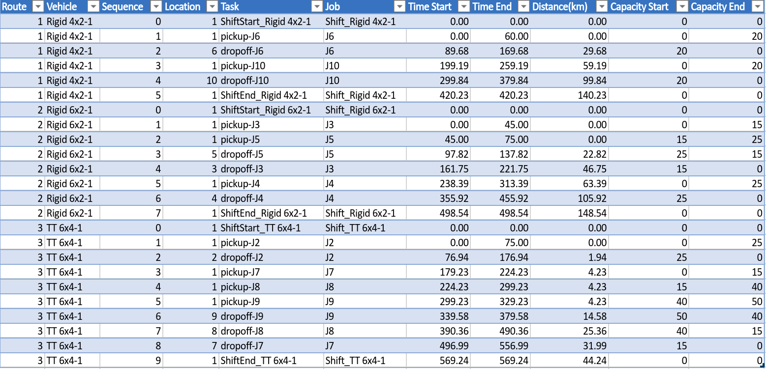 The solution output table has a row for each task that must tbe completed and the sequence in which it must be done. These columns are the same as for the CVRP output as explained here.