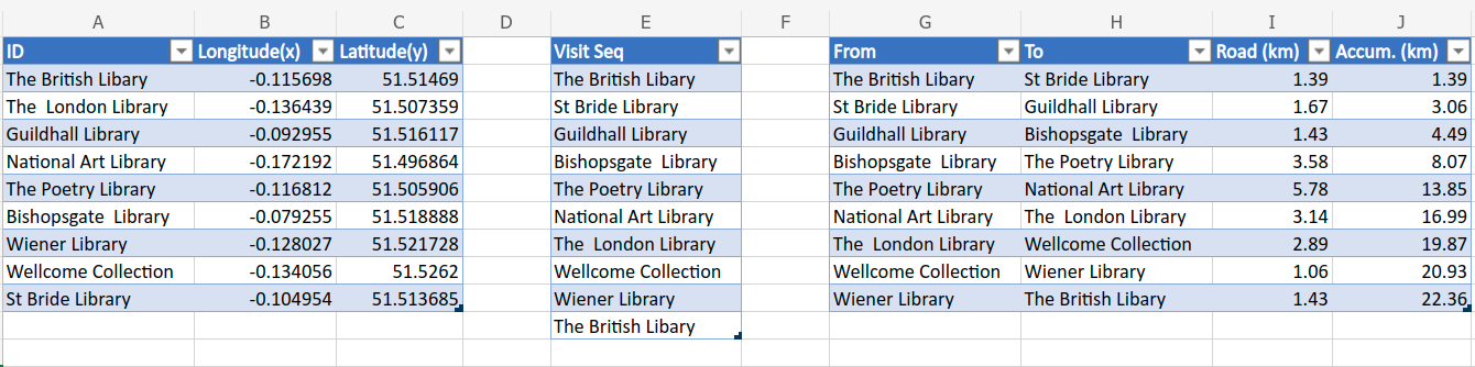 In addition to the order in which the locations are visited, a second table provides the distance between each visit within the trip and the total distance travelled [Accum.(km)] up to that point. Distances are provided in kilometres and the total trip distance is the last value in the Accum. column.