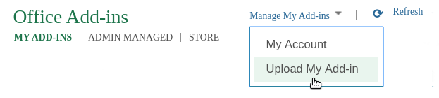 - Select ‘Manage My Add-ins’ on the top right of the Office Add-ins form and choose ‘Upload My Add-in’.